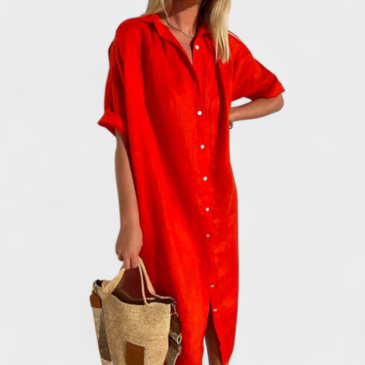 Deixe a primavera fluir com um vestido que combina sofisticação e leveza. Este modelo tipo chemise, com corte reto e botões frontais, traz uma silhueta descomplicada, perfeita para quem busca estilo sem esforço. O tecido leve garante conforto em dias quentes, enquanto o design versátil permite transitar com charme do passeio ao ar livre ao almoço casual com amigas. Um clássico moderno que nunca sai de moda.